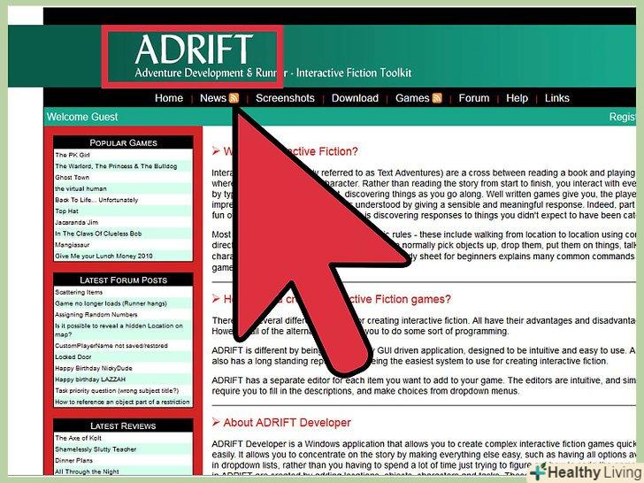 Використовуйте Adrift для зручного створення гри на Windows. Adrift - черговий популярний, проста мова і компілятор інтерактивної белетристики. Оскільки він покладається на графічний інтерфейс, а не на кодуванні, в ньому без праці можуть працювати люди, не знайомі з програмуванням. Adrift поширюється безкоштовно і доступний тільки для систем Windows, хоча створені з його допомогою гри можна запустити на будь-якій операційній системі або навіть в браузері.