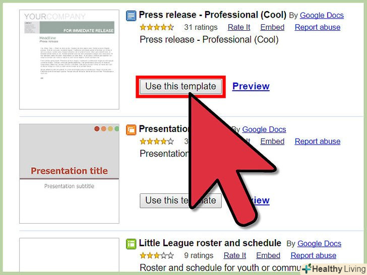 Виберіть шаблон. перегляньте знайдені шаблони. На сторінці будуть вказані назви шаблонів, імена їх власників і короткі описи. Натисніть на кнопку "Використовувати цей шаблон" поруч з тим шаблоном, який ви хочете використовувати.- Обраний шаблон буде завантажений в Google Документи.