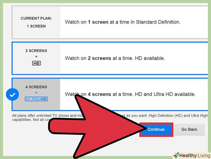 Виберіть потрібний план в розділі " Renewal Options "(Параметри Оновлення).тепер підтвердіть, що хочете внести зміни - вони вступлять в силу в наступний білінговий цикл.[3]- У більшості країн можна вибрати один з трьох планів: «One Screen in Standard Definition (SD)» (Один екран в стандартному дозволі), «Two Screens in High Definition (HD)» (Два екрани у високій роздільній здатності), «Four Screens with HD and Ultra HD (UHD)» (чотири екрани у високому і ультрависокому дозволі). Кожен наступний план дорожче попереднього, але розрахований на більше число глядачів і забезпечує кращу якість картинки. Деякі плани недоступні в певних країнах.