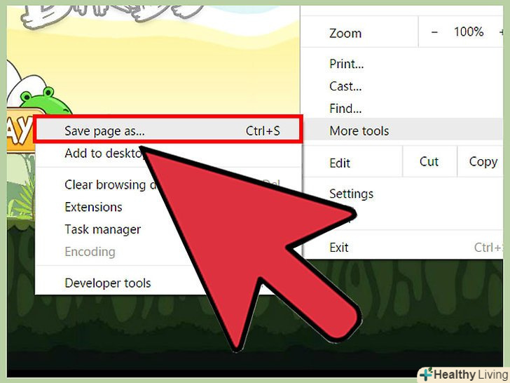 Натисніть на кнопку меню Chrome. ця кнопка розташована у верхньому правому куті вікна Chrome. Виберіть "Зберегти сторінку як" і збережіть файл там, де ви його потім легко зможете знайти. Назвіть його так, щоб потім його було легше шукати.