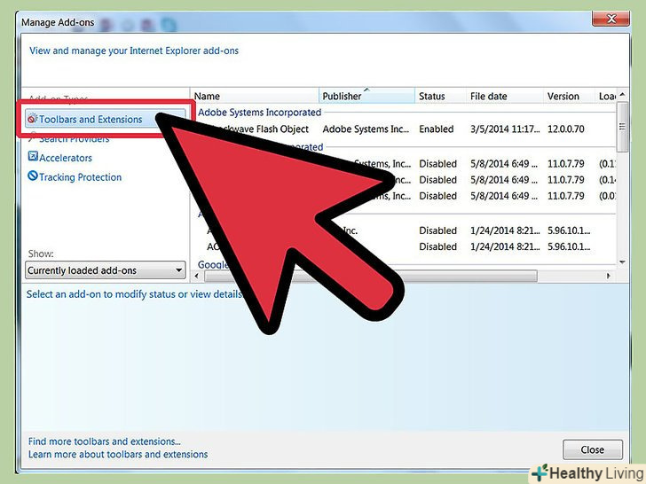 - Відкрийте менеджер налаштувань. якщо у вас встановлена панель інструментів або доповнення, яке ви більше не хочете використовувати, то ви можете видалити його з Internet Explorer. Щоб зробити це, натисніть Інструменти → Управління доповненнями".