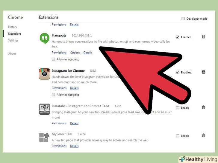 Відкрийте менеджер доповнень. якщо у вас встановлена панель інструментів або доповнення, які ви більше не хочете використовувати, ви можете видалити його з Chrome. Додатки в Chrome називаються "розширеннями". Натисніть кнопку Menu (Розширення), виберіть Сервіс → Розширення. Це відкриє нову вкладку зі списком всіх встановлених розширень.