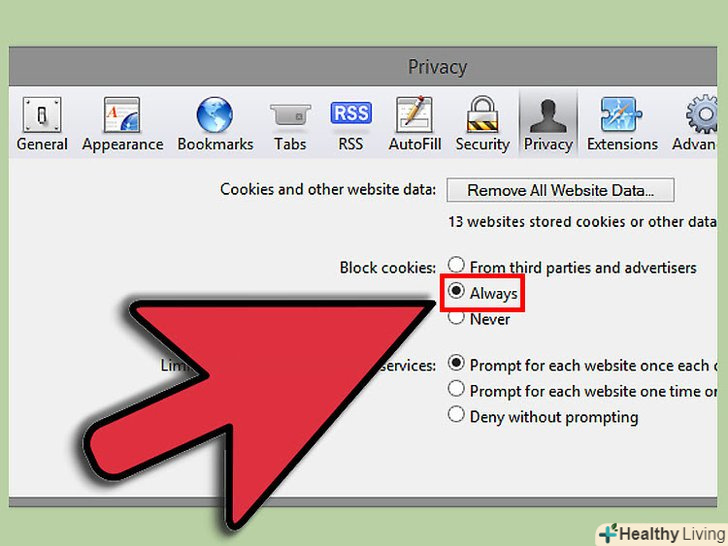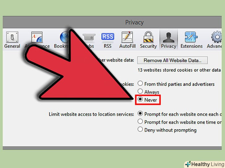 У розділі під назвою "Block cookies" виберіть "Never". виберіть пункт "From third parties and advertisers", щоб заборонити "третім сторонам" і "рекламодавцям" відповідно отримувати доступ до вашої особистої інформації і налаштувань.