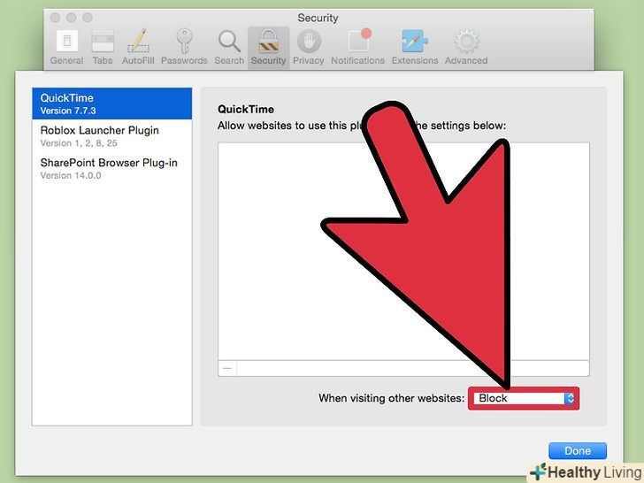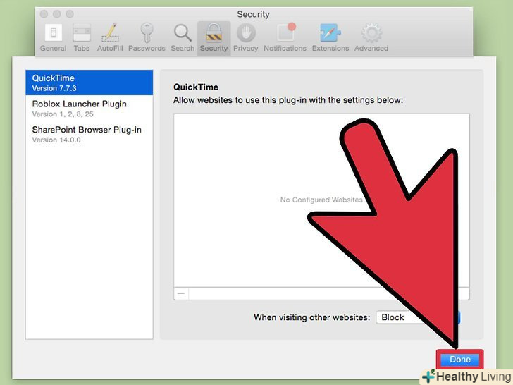 Натисніть на спливаюче меню "при відвідуванні інших веб-сайтів «і виберіть в ньому»заблокувати". Java буде відключена на сайтах, яких немає в списку. Тепер натисніть Готово . [4]