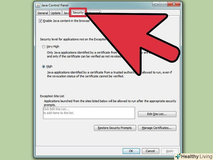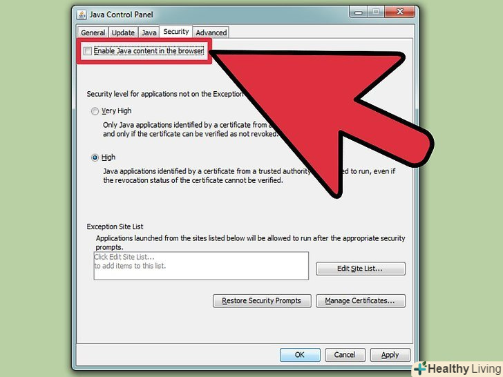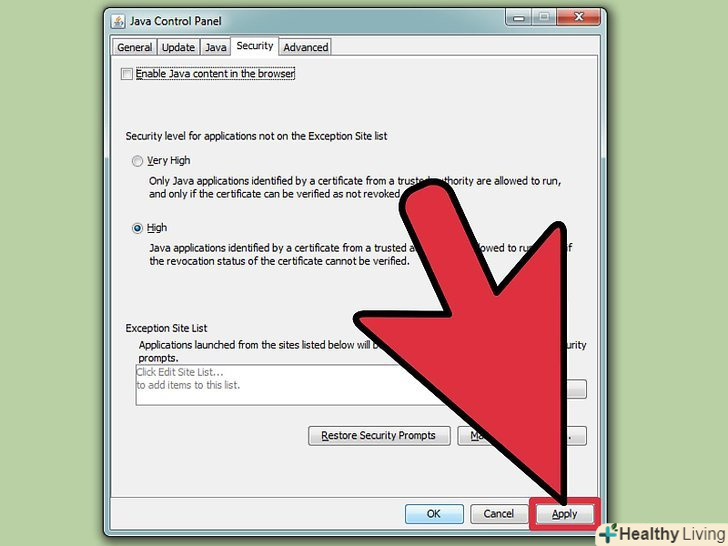 Зніміть прапорець біля " Enable Java content in the browser "(включити Java в браузері). Java буде відключена. Натиснути Apply (Застосувати), щоб зберегти внесені зміни.