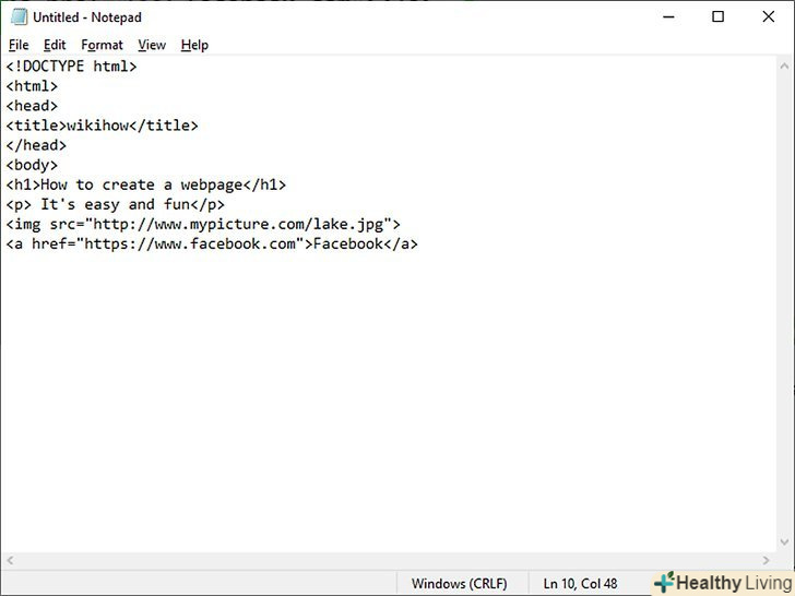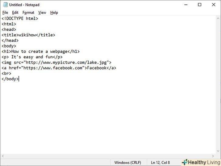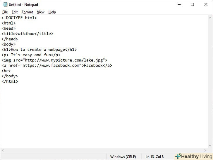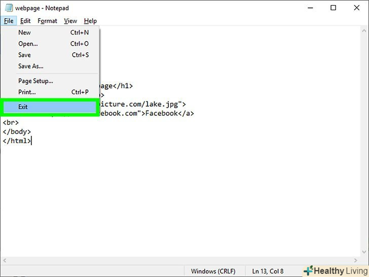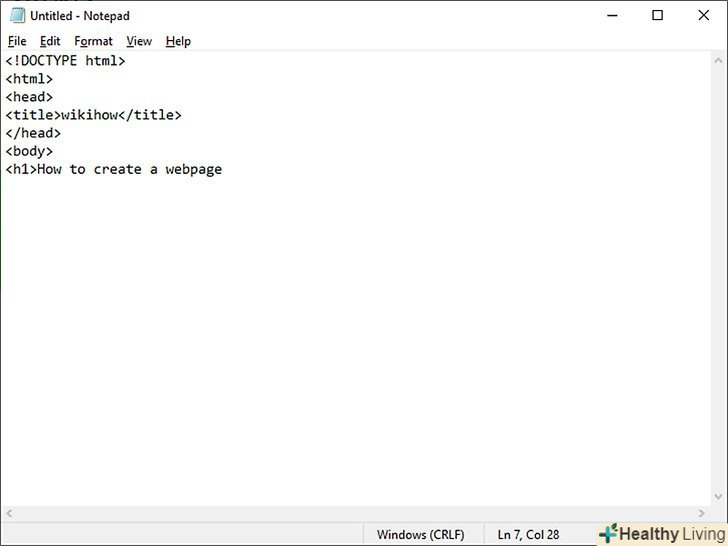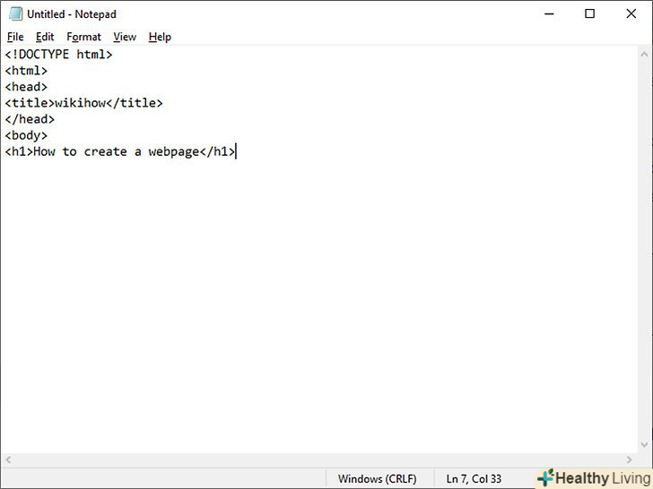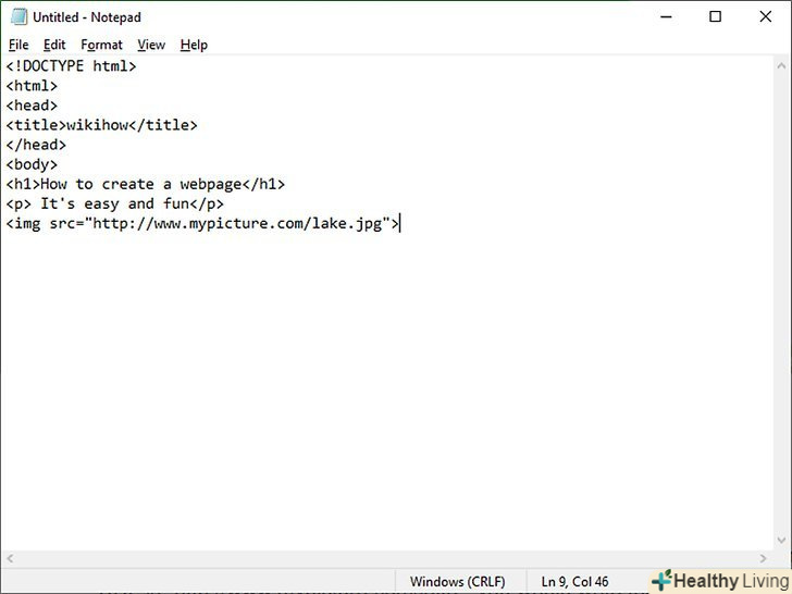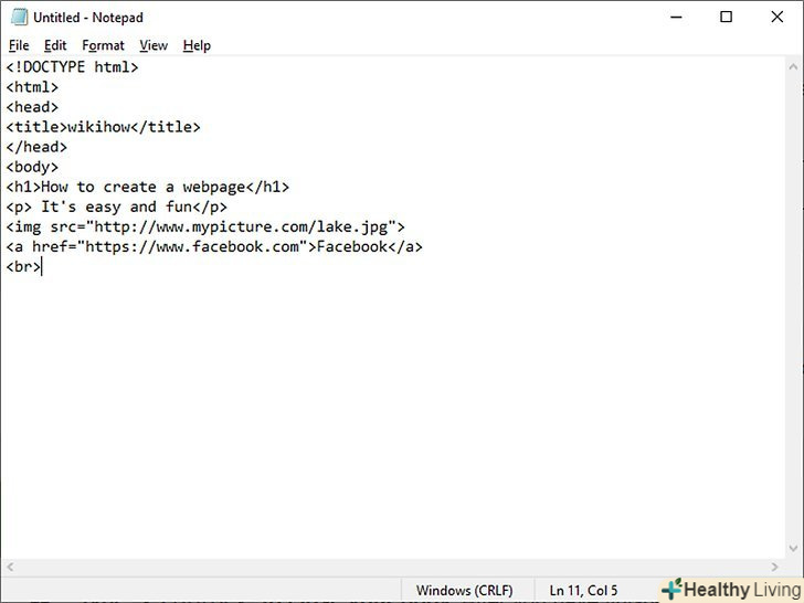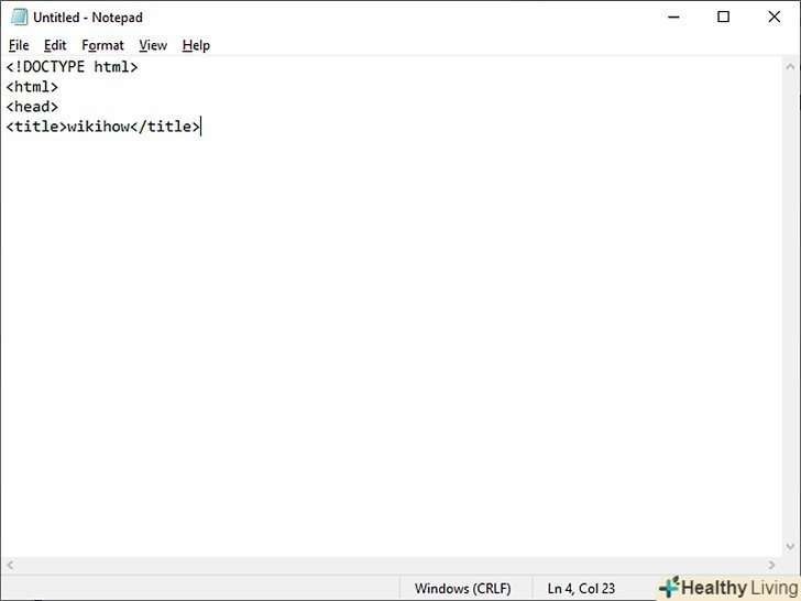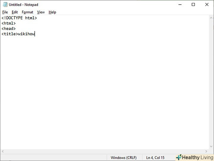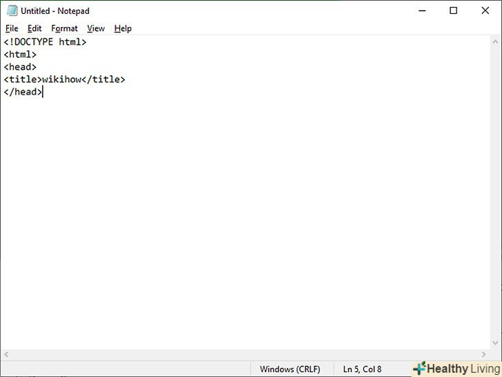 Введіть lt;/headgt; і натисніть ↵ Enter . цей тег закриває тег опису сторінки. На даному етапі HTML-код повинен виглядати приблизно так.lt;!DOCTYPE htmlgt; lt;Htmlgt; lt;Headgt; lt;Titlegt; Моя веб-сторінка lt;/Titlegt; lt;/Headgt;