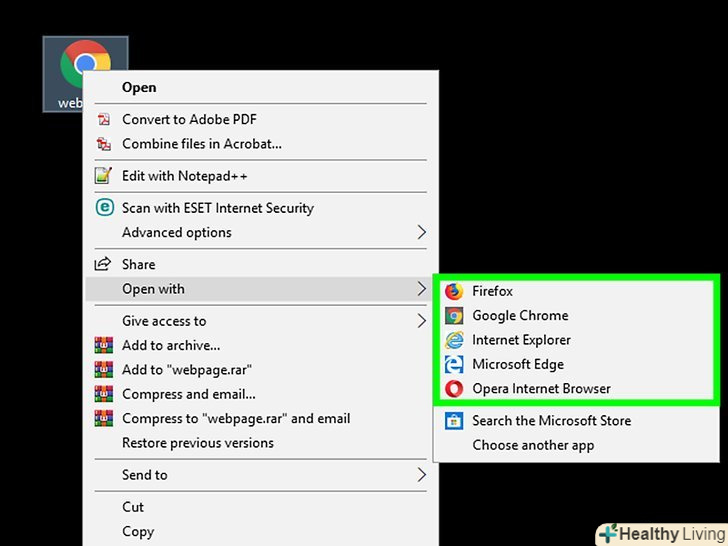Відкрийте HTML-файл у браузері. для цього двічі клацніть по HTML-файлу. Якщо відкрилося повідомлення про помилку, зробіть наступне:- Windows - клацніть по файлу правою кнопкою миші, виберіть «Відкрити за допомогою», а потім натисніть на потрібний браузер.