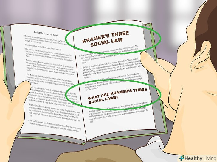 Уважно вивчіть заголовки і підзаголовки.перетворіть їх на питання і зосередьтеся на важливих поданих ідеях. Наприклад, заголовок "Три соціальні закони Крамера" слід перефразувати на запитання: "Які три соціальні закони Крамера?"Потім прочитайте відомості, в яких є відповідь на це питання.[2]- Слід знати, що заголовки і підзаголовки, виділені жирним шрифтом або курсивом - це ключ до найбільш важливої інформації.