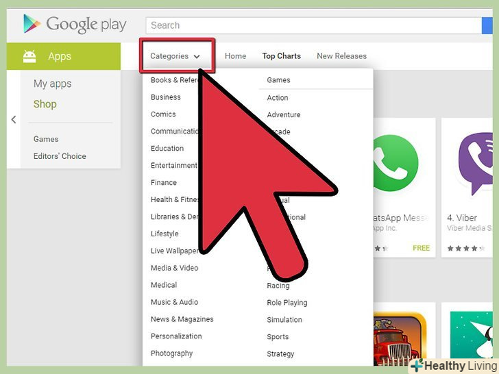 Переглядайте популярні безкоштовні програми за категоріями. якщо ви знаєте, що вам потрібно, відкрийте вкладку категорії у верхній лівій частині екрана, щоб побачити великий список, що складається з ігрових і не ігрових категорій.- Виберіть категорію, яка вас цікавить.