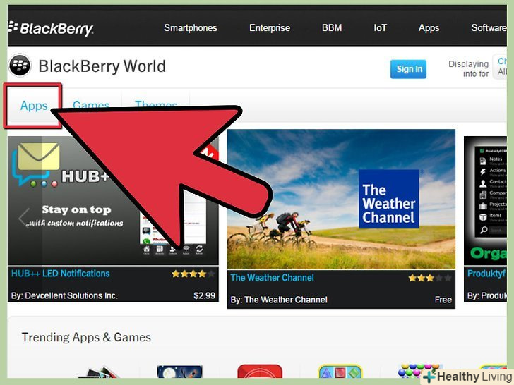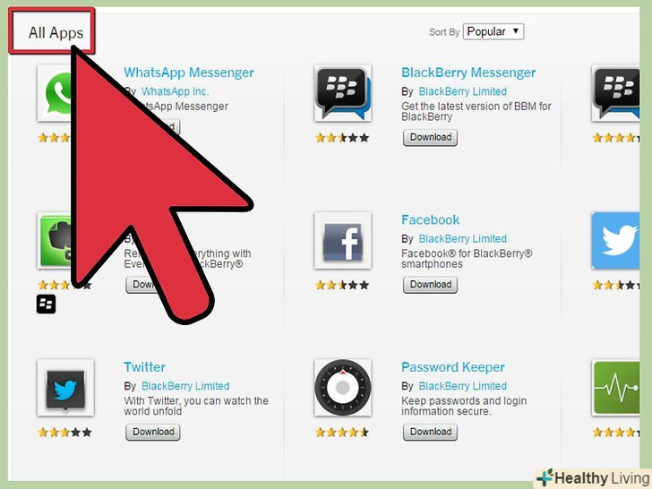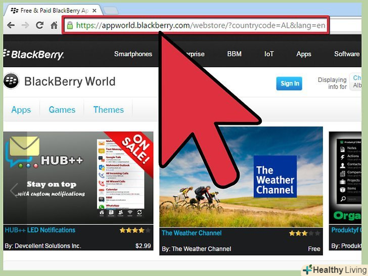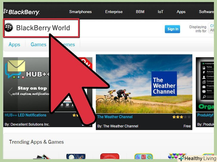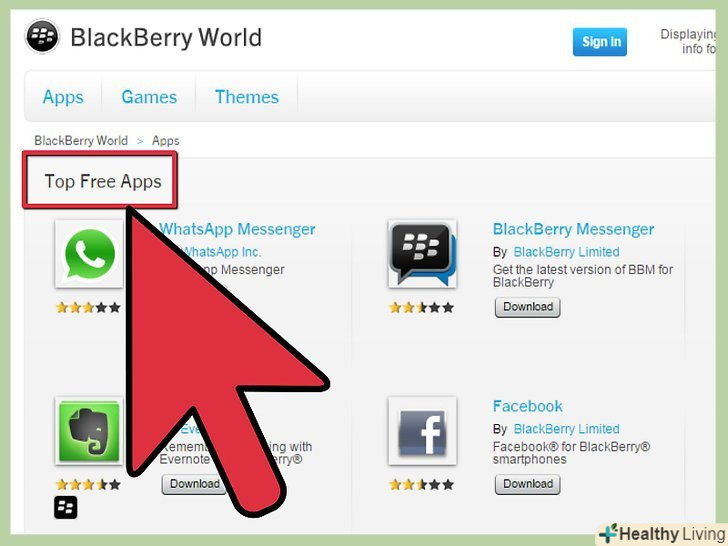 Відвідайте BlackBerry World.це місце, де знаходяться всі програми для BlackBerry. Щоб відвідати BlackBerry World, перейдіть за посиланням http://appworld.blackberry.com/webstore/?countrycode=ruamp;lang=uk .- Якщо ви відразу хочете завантажувати додатки на ваш пристрій, Встановіть додаток BlackBerry World на ваш смартфон.