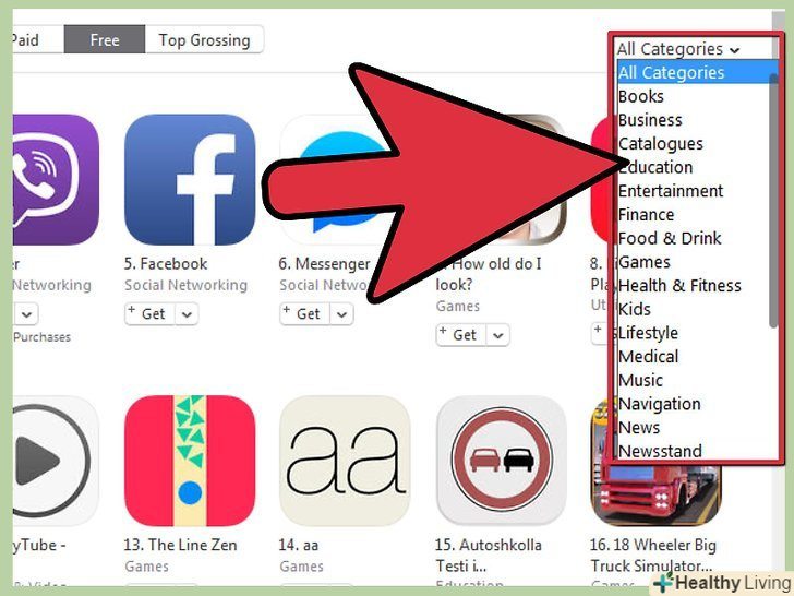 Сортуйте за типом, потім за ціною. спочатку ви можете вибрати категорію додатків, потім шукати в ній безкоштовні варіанти; однак найбільш популярні безкоштовні програми можна знайти наступним способом:- На сторінці AppStore натисніть випадаюче меню у верхньому правому куті та виберіть категорію. Ви також можете натиснути стрілку поруч із написом AppStore у темному рядку у верхній частині екрана.