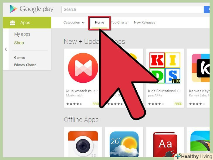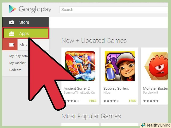 Відвідайте сайт Google Play Store.для цього перейдіть за посиланням https://play.google.com/store.- У лівому меню виберіть Програми для Android.