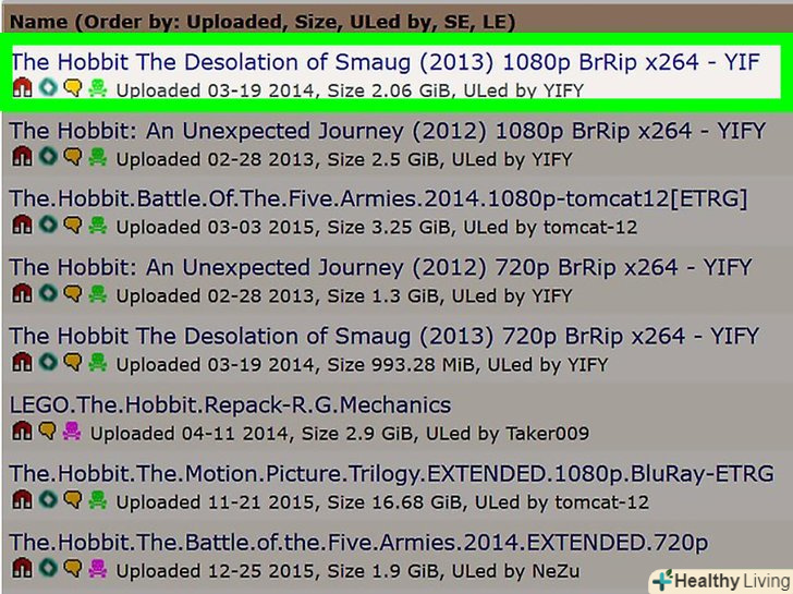 Знайдіть фільм у пошуковій системі BitTorrent .для пошуку торрент-файлів можна використовувати не тільки величезну кількість популярних торрент-трекерів і торрент-каталогів, але і звичайні пошукові системи, такі як Google. Багато торрент-трекери і торрент-каталоги містять інвазивну рекламу, графічні матеріали для дорослих і іноді навіть файли, що містять шкідливі програми або віруси. Переконайтеся в безпеці і надійності сайту, перш ніж завантажувати з нього що-небудь.- На сайтіHttp://www.publicdomaintorrents.info представлені тільки легальні фільми, які можна завантажити за допомогою BitTorrent, тому почати краще саме з нього.