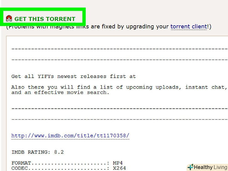 Збережіть торрент файл на ваш комп'ютер. після того, як Ви знайшли торрент файл, користуючись методами, описаними в розділі Пошук безкоштовних фільмів, натисніть Зберегти/Завантажити, щоб зберегти торрент файл на ваш комп'ютер. Цей файл завантажиться швидко, але він не є файлом фільму.- Якщо Ви користуєтеся громадським торрент трекером, наприклад isoHunt, перевірте рейтинги і коментарі до фільму, перш ніж завантажувати його. Завдяки цьому ви зможете дізнатися про можливі проблеми, пов'язані із завантаженням файлу.