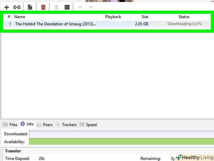 Відкрийте торрент файл за допомогою торрент клієнта. за допомогою вашого торрент клієнта, знайдіть торрент файл на комп'ютері, і відкрийте його. Після цього почнеться завантаження фільму.- Коли ви відкриваєте файл, програма читає інструкції, який в ньому знаходяться, і знаходить файл фільму для завантаження.