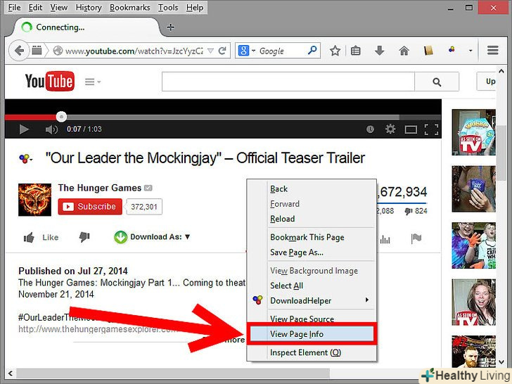 Завантажте відео .після того, як закінчилася буферизація, натисніть правою кнопкою миші по сторінці. Виберіть "Переглянути інформацію по сторінці"з меню. Відкриється вікно з докладною інформацією про сайт. Там буде кілька іконок, що відкривають різні частини сайту.- Якщо ви натиснете по відео правою кнопкою миші, ви не побачите того ж меню. Натискати потрібно на порожньому місці сторінки, а не на відео.