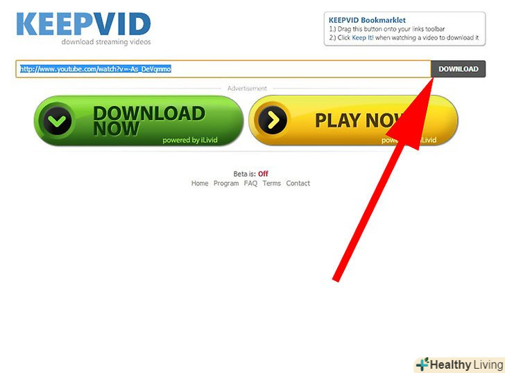 Введіть посилання URL на відео.скопіюйте адресу відео з адресного рядка в браузері. Вставте його в поле для введення адреси на сайті KeepVid. Натисніть на кнопку Скачати (Download).- Не натискайте на велику зелену кнопку Download над текстовим полем. Це реклама.
