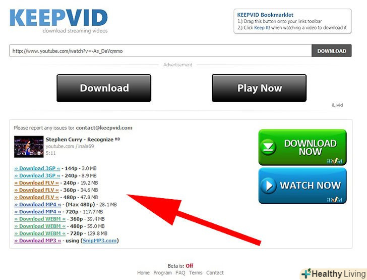Виберіть формат файлу.після того як відео завантажитися на KeepVid, вам дадуть кілька посилань, за якими можна завантажити відео в різних форматах. Найкраще качати формат MP4, так як його можна програвати майже на всіх пристроях, на відміну від формату FLV.- Вам запропонують вибрати якість відео. Найкраща якість це 1080p, 720p, воно займає більше місця на диску, а відео нижчої якості 480p, 360p займає менше місця.