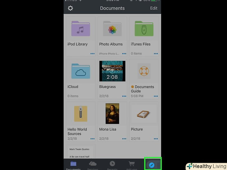 Відкрийте веб-браузер у додатку Documents. натисніть на значок Safari в правому нижньому кутку екрану.