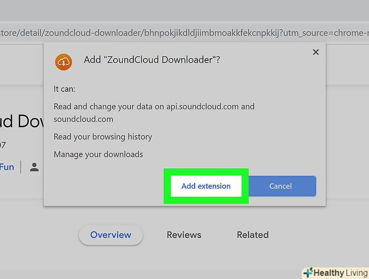 НатиснітьВстановити розширення, коли з'явиться запит. Розширення Zoundcloud Downloader буде встановлено в браузері Chrome.