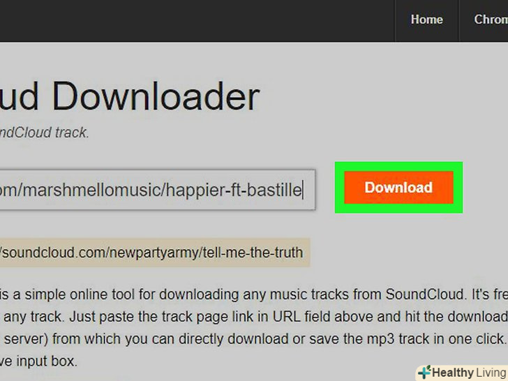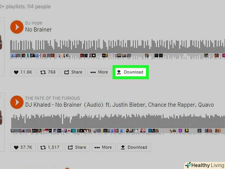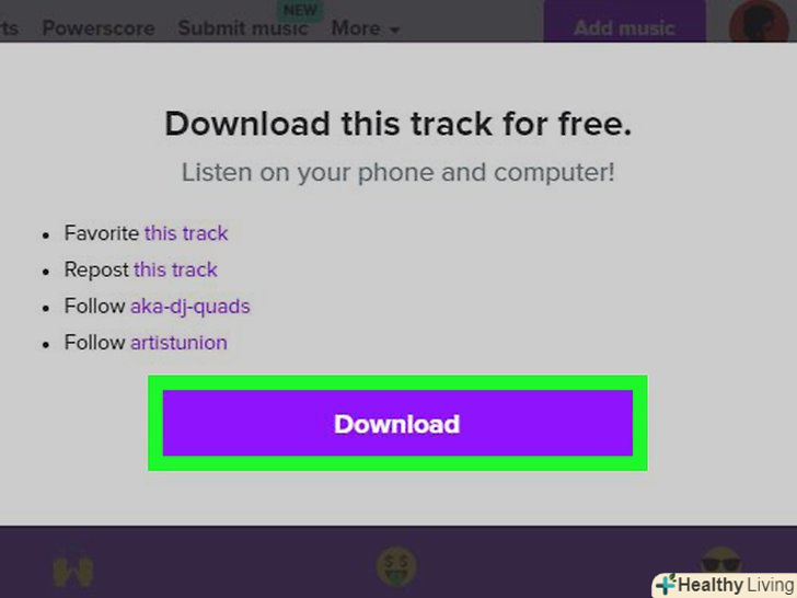 З цієї статті ви дізнаєтеся, як завантажити пісні з сайту SoundCloud на комп'ютер. Деякі пісні можна завантажити безпосередньо з SoundCloud, але для більшості композицій знадобиться розширення для браузера Chrome або спеціальний онлайн-сервіс. Якщо Виконавець дозволяє завантажувати свої твори, біля них відобразиться відповідна кнопка. Щоб завантажити музику на мобільний пристрій, скористайтеся додатком SoundCloud Go або SoundCloud Go +. Якщо для скачування пісень Ви користуєтеся сторонніми сервісами, пам'ятайте про авторські права.