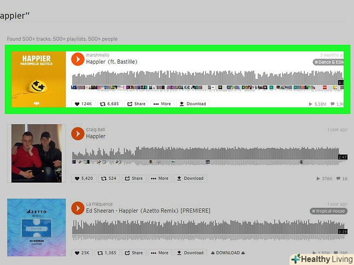 Натисніть на назву пісні, яку хочете завантажити. Відкриється сторінка пісні.- Якщо натиснути на значок у вигляді звукової хвилі, який знаходиться у назви, сторінка пісні не відкриється.
