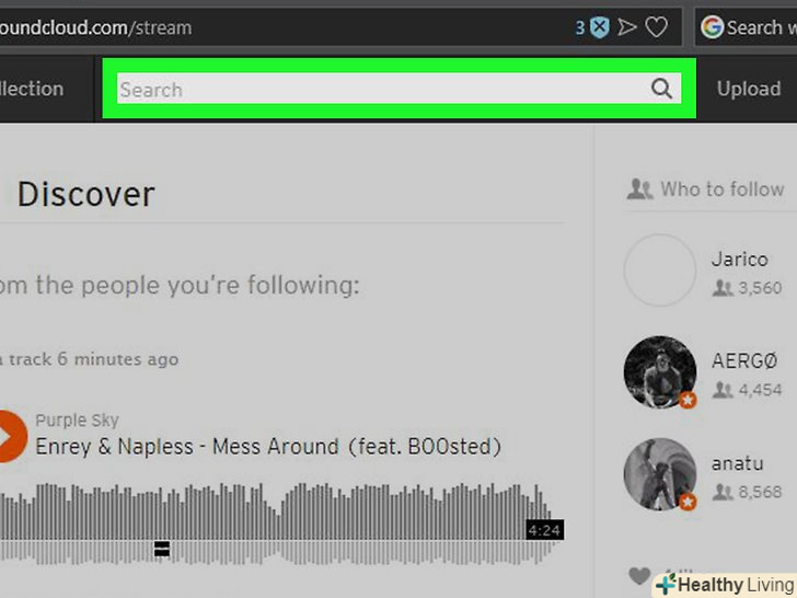 Натисніть на рядок пошуку. вона знаходиться посередині сторінки і містить текст " Search for artists, bands, tracks, podcasts» (пошук виконавців, груп, треків, подкастів).- Якщо ви ввійшли в обліковий запис SoundCloud, рядок пошуку знаходиться вгорі сторінки.