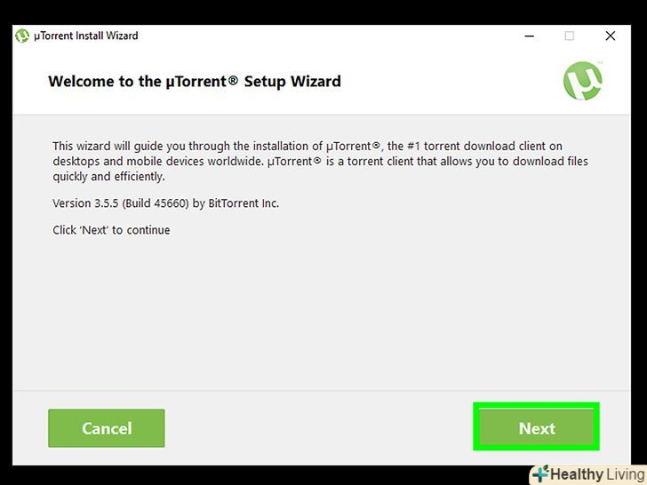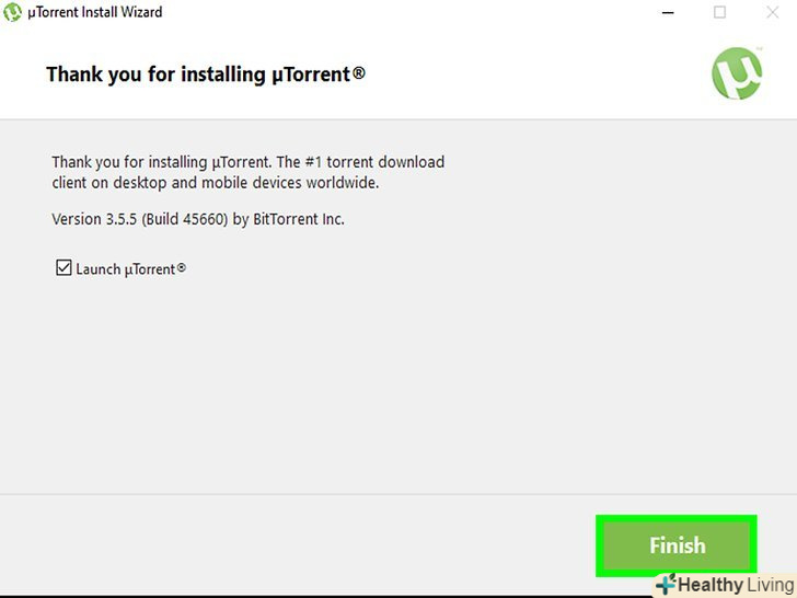 Встановіть μTorrent. процес установки буде залежати від операційної системи, встановленої на комп'ютері:- Windows: двічі клацніть по файлу μTorrent, натисніть Так при появі запиту, двічі натиснітьДалі, потімПриймаю, налаштуйте параметри ярликів і натиснітьДалі, потім зновуДалі і натиснітьВідмовитися від рекомендованих програм. Натисніть Готово, щоб завершити установку.