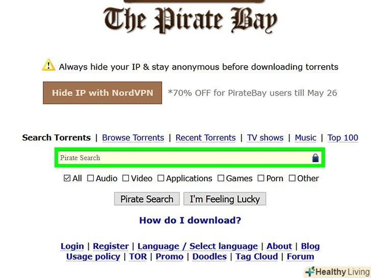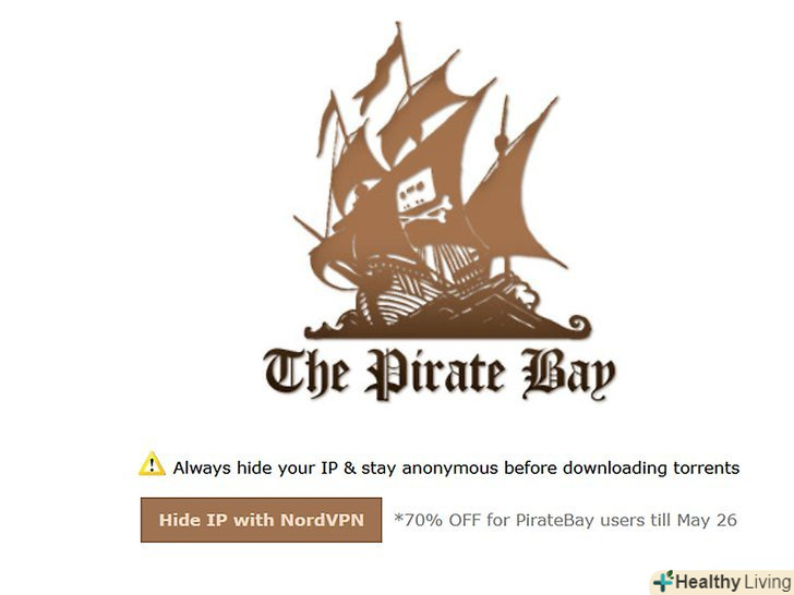 Пошук торрент-трекера.Торрент-трекери, як правило, приходять і йдуть (з правових причин), тому вам варто пошукати працюючий сайт, а не покладатися на конкретний торрент-трекер.- Щоб знайти робочий торрент-трекер, пошукайте "торренти" в Google або аналогічній пошуковій системі, а потім перегляньте результати пошуку.