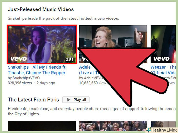 Перейдіть на YouTube і знайдіть відео, яке потрібно конвертувати. Значок встановленого розширення буде показаний біля вікна відео (вище або нижче, але деякі розширення також можуть з'явитися справа вгорі).- Якщо вам не вдається знайти значок розширення, то перейдіть на сайт розширення (з нього ви вже завантажували додаток) і прочитайте інструкції або перегляньте знімки екрану, щоб побачити, де повинні з'явитися додаткові кнопки на сторінці YouTube.