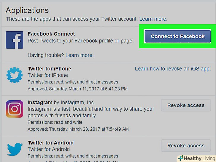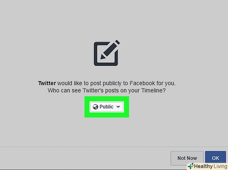 Натисніть Дозволити.тепер ваші твіти будуть автоматично публікуватися в Facebook, і буде відображатися ваше ім'я користувача. Відповіді публікуватися не будуть.- Перегорніть в самий низ вашого профілю, щоб перевірити успішність підключення. Там повинно бути написано»ваш аккаунт підключений до Facebook".