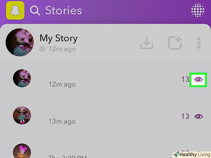 Торкніться піктограми ока поруч зі знімком.відобразіть список всіх користувачів, які переглядали даний знімок.- Прокрутіть вниз, щоб побачити список всіх користувачів, які переглянули знімки у вашій історії. Список буде відображений у зворотному хронологічному порядку. Ім'я внизу списку-це перший користувач, який переглянув ваш знімок, а ім'я вгорі списку-користувач, який переглянув знімок останнім.