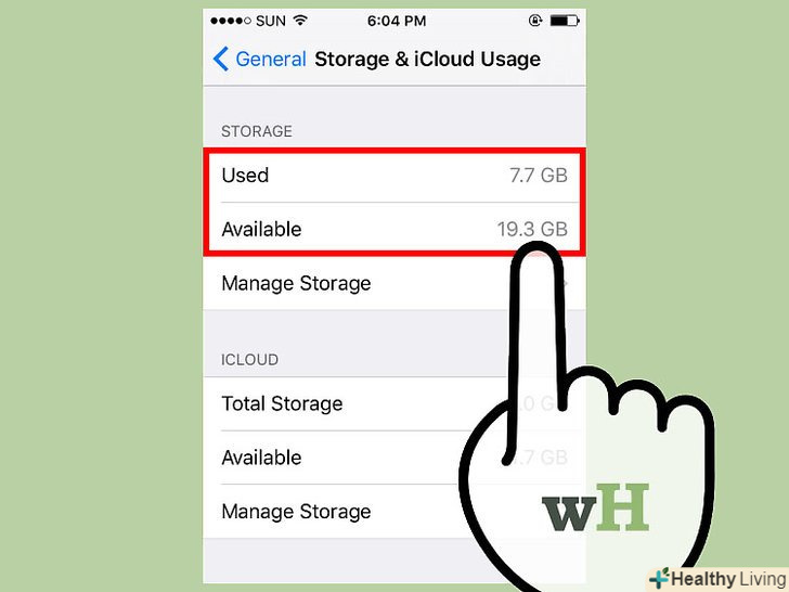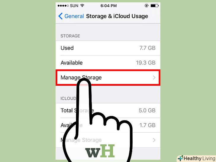 Натисніть "Керувати сховищем «в розділі» сховище «або»iCloud".на екрані відобразиться інформація про те, який обсяг пам'яті займають додатки, зображення і так далі.- Скористайтеся цією інформацією, щоб очистити пам'ять. Наприклад, якщо кілька гігабайт пам'яті зайнято текстовими повідомленнями, видаліть їх, щоб збільшити обсяг вільної пам'яті.
