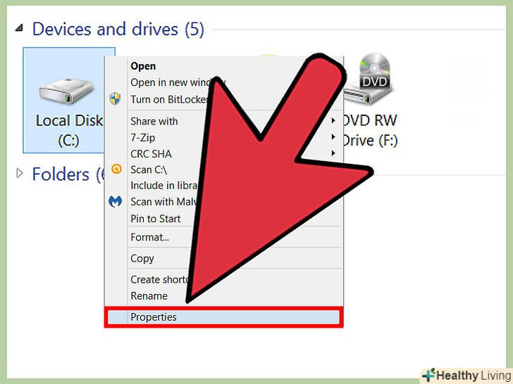 Клацніть правою кнопкою миші по потрібному локальному диску і в меню виберіть «Властивості».відкриються параметри жорсткого диска. [2]
