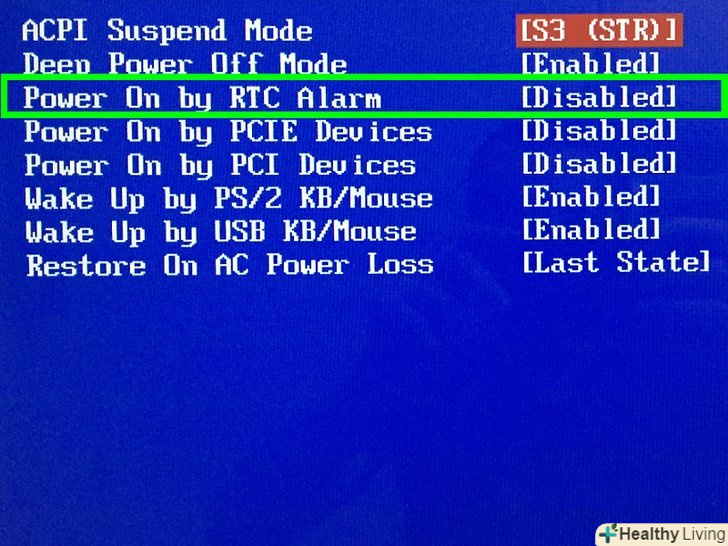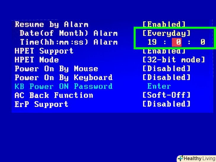 Перейдіть до опціїPower on Alarm (включення за розкладом) або RTC alarm (розклад).назва цього меню залежить від виробника материнської плати, а саме меню може перебувати в меню «Advanced» (Додаткові).[2]