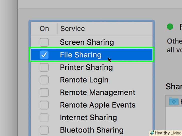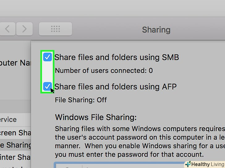 Встановіть прапорці у обох опцій.вони знаходяться у верхній частині вікна.[2]- Якщо з спільною папкою буде працювати комп'ютер під управлінням Windows, встановіть прапорець у "загальний доступ до Windows".