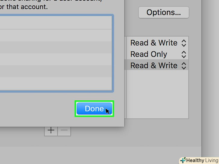 Клацніть поГотово.ця опція знаходиться в нижній частині вікна. Зміни будуть збережені, і активований загальний доступ до файлів на комп'ютері Mac.- Якщо спільний доступ до файлів не увімкнено, установіть прапорець ліворуч від "спільний доступ до файлів" у лівій частині вікна.