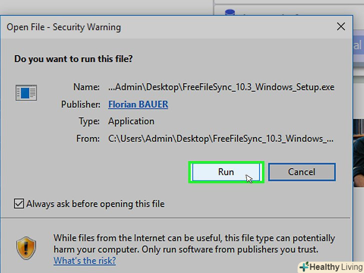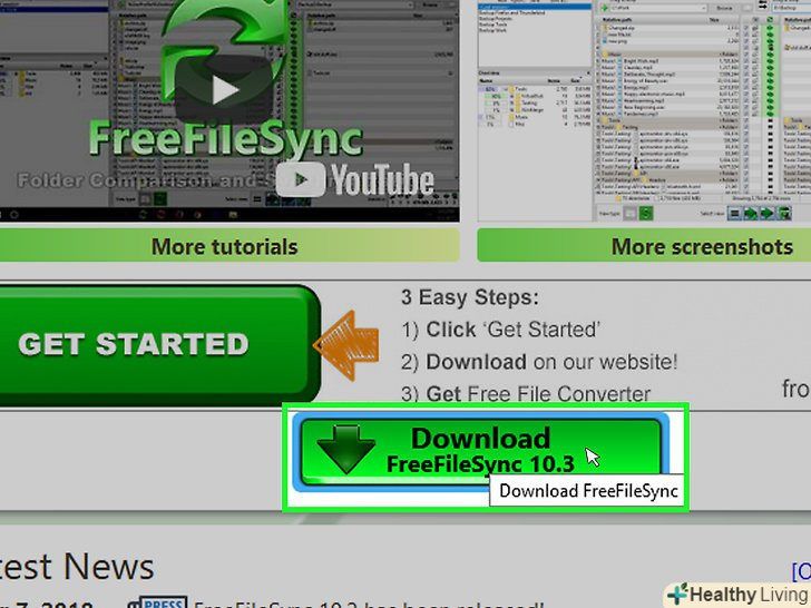 Скачайте FreeFileSync. перейдіть на сторінку https://freefilesync.org / , натисніть на зелену кнопку " Download "(завантажити) в нижній частині вікна, прокрутіть вниз до заголовка " Download FreeFileSync "(завантажити FreeFileSync) і натисніть на посилання, відповідне вашій операційній системі.- Наприклад, натисніть "Download FreeFileSync 10.0 Windows Setup" для Windows або "Download FreeFileSync 10.0 macOS" для Mac OS X.