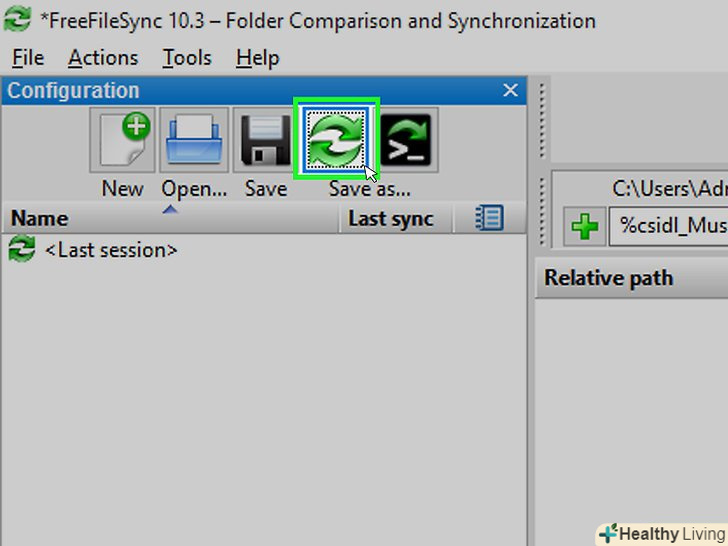 Збережіть конфігурацію FreeFileSync.якщо ви хочете синхронізувати папки в майбутньому, збережіть налаштування у файлі конфігурації:- Натисніть на " Save as "(Зберегти як); це зелений значок у вигляді круглої Стрілки у верхній лівій частині вікна;