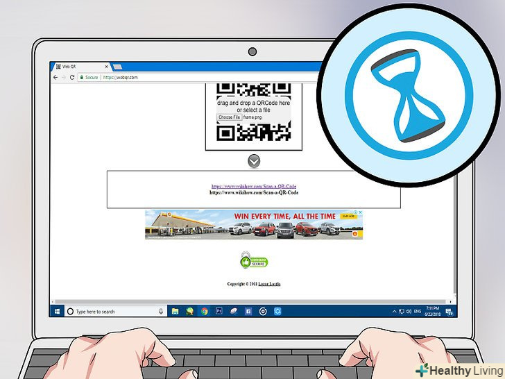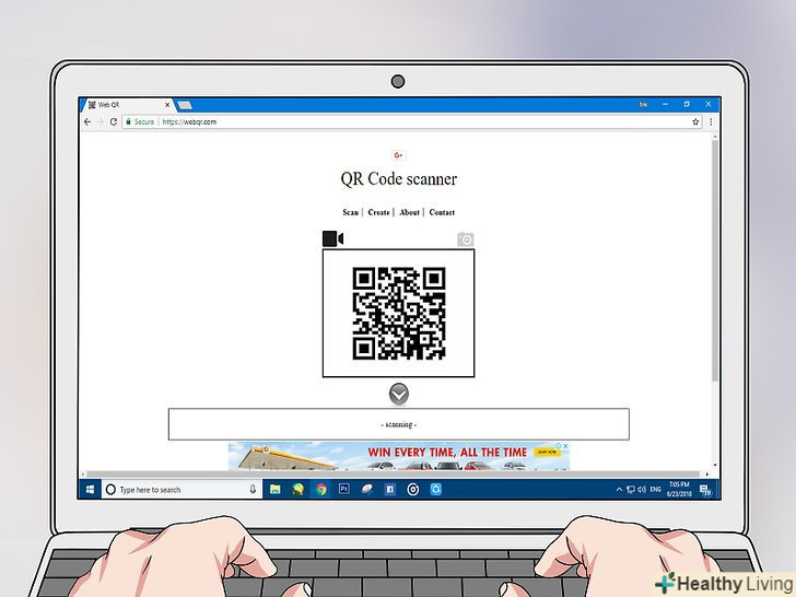 Піднесіть QR-код до камери. QR-код повинен бути звернений до камери комп'ютера. Код відобразиться у вікні сканування, яке знаходиться посередині сторінки.- Також QR-код можна завантажити з комп'ютера; для цього клацніть по значку у вигляді камери над верхнім правим вікном сканування, натисніть «Огляд», клацніть по файлу з QR-кодом, а потім натисніть «Відкрити».