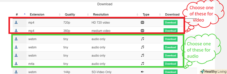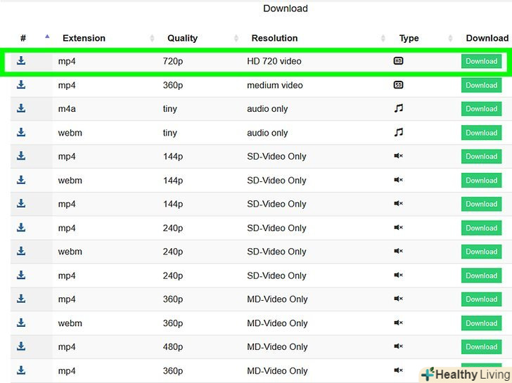 - Прокрутіть сторінку вниз і в списку виберіть найкращу якість картинки, наприклад, "HD 720 video". Якщо ви хочете завантажити тільки звук, виберіть опцію "Audio only" (тільки звук). Тепер натиснітьDownload (завантажити). Ця зелена кнопка знаходиться поруч обраним якістю картинки або звуку.