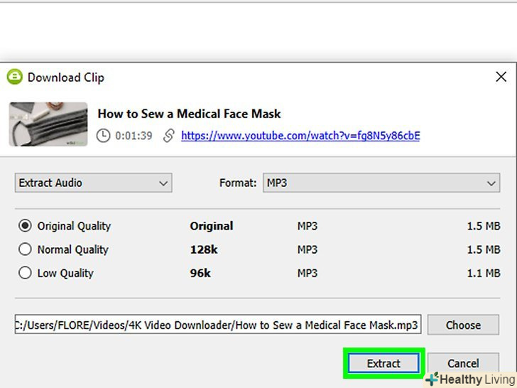 НатиснітьВитягти.ця опція знаходиться внизу вікна. Запуститься процес вилучення музики з відеоролика. Коли процес завершиться, аудіофайл буде збережений в обраній папці.- Двічі клацніть по аудіофайлу, щоб відтворити його в основному аудіоплеєрі.
