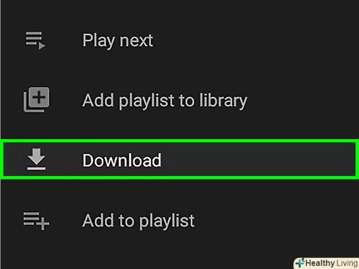 Торкніться значка у вигляді стрілки, щоб завантажити пісню, або натисніть на значок⁝, щоб завантажити список відтворення. якщо ви завантажуєте пісню, вона буде завантажена на смартфон або планшет і стане доступна для автономного прослуховування. Якщо ви завантажуєте список відтворення, перейдіть до наступного кроку.[3]