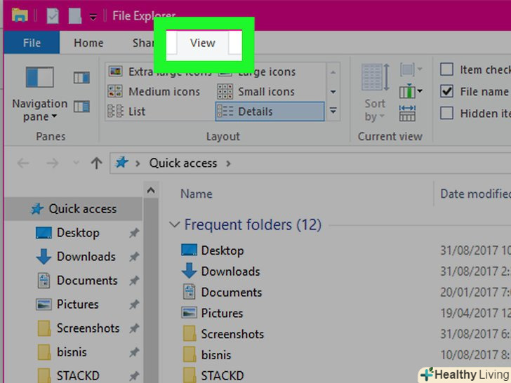 НатиснітьВид.ця вкладка розташована у верхній лівій частині вікна Провідника. Відкриється меню.