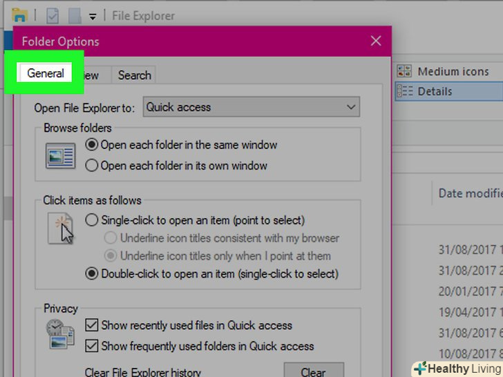 Клацніть по вкладціЗагальні. вона знаходиться у верхньому лівому кутку вікна "Параметри папки".