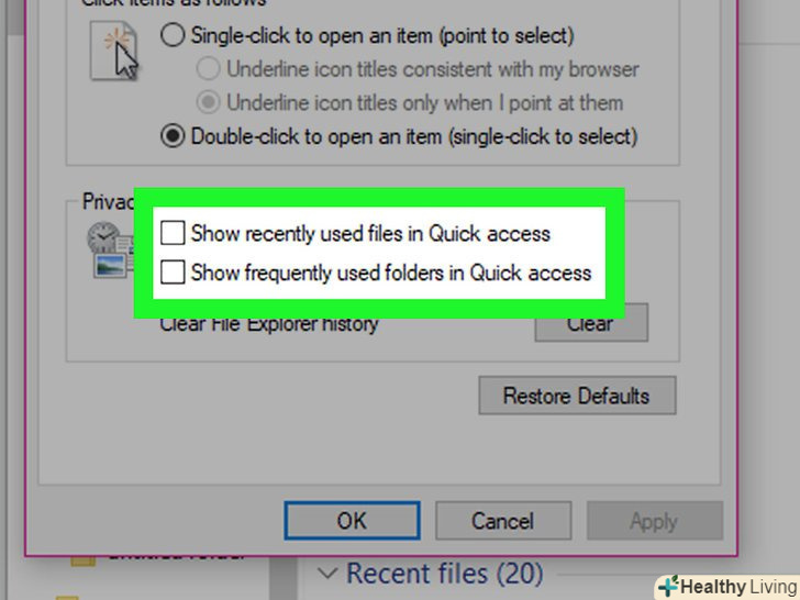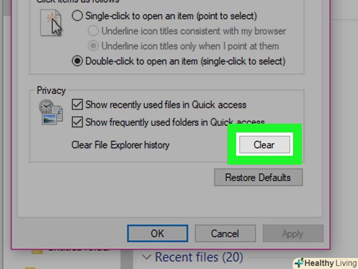 КлацнітьОчистити.ця опція знаходиться в розділі "Конфіденційність" в нижній частині вікна. Так ви видалите останні запити з Провідника.- Якщо ви закріпили якусь папку або файл в Провіднику, вони не будуть видалені.