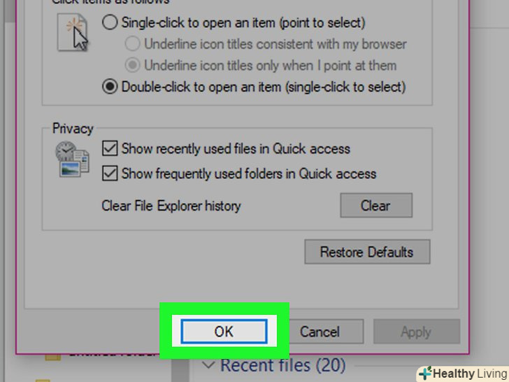Клацніть поOK.ця кнопка знаходиться в нижній частині вікна "Параметри папки". Так ви очистите історію провідника.