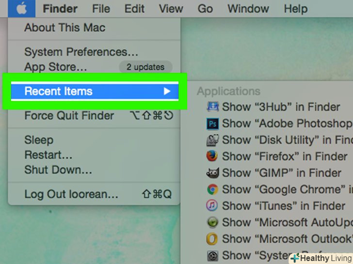 ВиберітьНещодавно використані об'єкти.ця опція знаходиться у верхній частині меню Apple, що випадає. Відкриється спливаюче меню зі списком недавно відкривалися додатків і файлів.