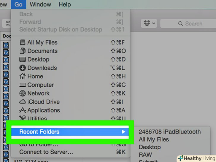 ВиберітьНещодавно використані файли. ця опція знаходиться в нижній частині меню, що випадає «перехід". Праворуч від зазначеної опції відкриється спливаюче вікно зі списком недавно відкривалися папок.