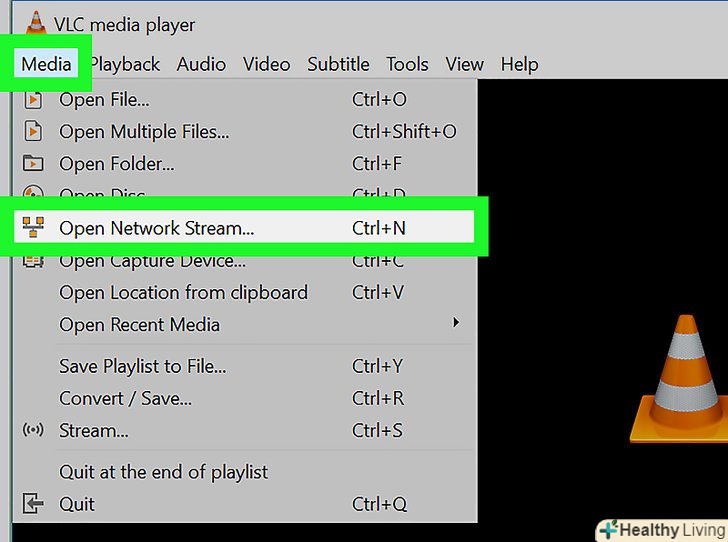 Відкрийте відео в VLC.- У Windows натисніть Медіа gt; Відкрити URL .